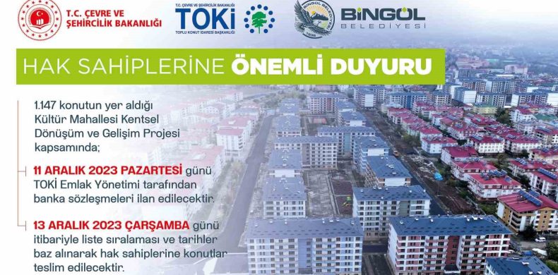 Bingöl Belediyesi, Kültür Mahallesi Kentsel Dönüşüm ve Gelişim Projesinde hak sahiplerine ait konutların teslimat sürecinin başlatıldığını bildirdi.